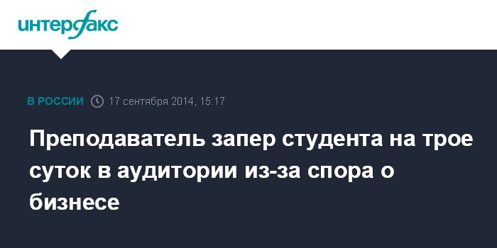 Москва. 17 сентября. INTERFAX.RU - Студент вологодского вуза провел три дня в запертой аудитории, где его оставил преподаватель, возмутившийся несогласием по поводу ведения совместного бизнеса.