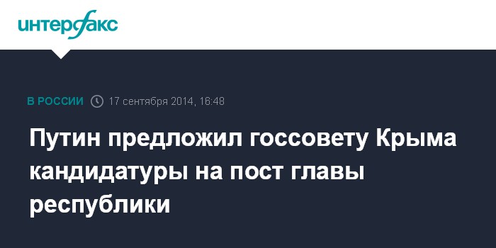 Москва. 17 сентября. INTERFAX.RU - Президент России Владимир Путин внес на рассмотрение Государственного совета Республики Крым трех кандидатов для избрания на должность главы республики, сообщает пресс-служба Кремля.