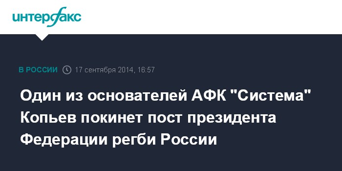 Это решение связано с ситуаций вокруг АФК "Система", одним из основателей которой является Копьев. "Эта новость (об аресте основного владельца АФК "Системы" Владимира Евтушенкова - ИФ) некстати. Сейчас Копьеву явно не до регби", - сообщил источник.