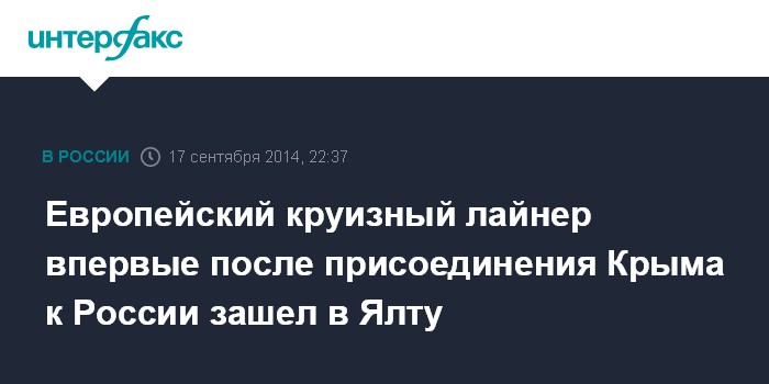 Москва. 17 сентября. INTERFAX.RU - Круизный лайнер европейской компании впервые после присоединения Крыма к России зашел в Ялту, сообщил "Интерфаксу" дежурный Ялтинского морского порта.