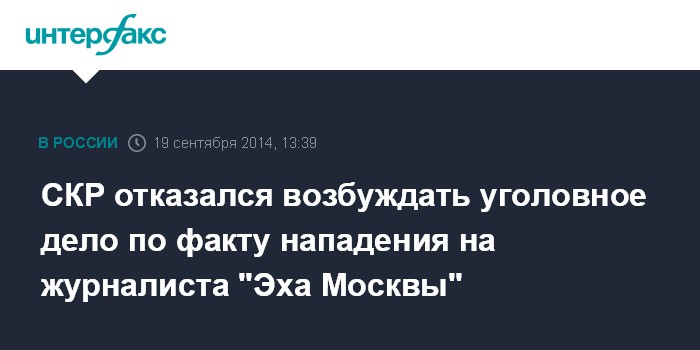 Москва. 19 сентября. INTERFAX.RU - Следственный комитет РФ отказался возбуждать уголовное дело по факту нападения на корреспондента "Эха Москвы" в Санкт-Петербурге Арсения Веснина. Об этом сам журналист сообщил на странице в фейсбуке в пятницу.