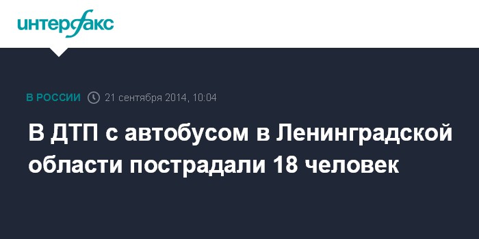 Москва. 21 сентября. INTERFAX.RU - В результате аварии с автобусом в Ленинградской области пострадали 11 детей и семь взрослых, сообщает пресс-служба ГУ МВД РФ по Санкт-Петербургу и Ленинградской области.