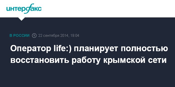 Москва. 22 сентября. INTERFAX.RU - Оператор мобильной связи ООО "Астелит" (бренд life:)) намерен полностью восстановить работу крымской сети, если внешние обстоятельства позволят это сделать, сообщила агентству "Интерфакс" руководитель PR-департамента оператора Оксана Рудюк.