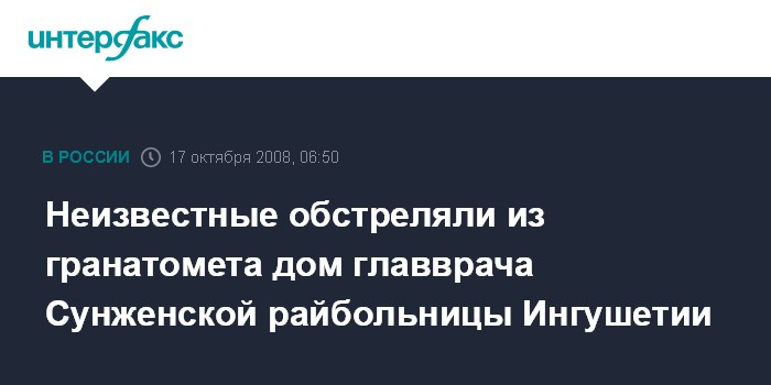Ростов-на-Дону. 17 октября. ИНТЕРФАКС-ЮГ - Дом главврача Сунженской райбольницы обстреляли неизвестные из гранатомета, пострадавших нет, сообщили агентству "Интерфакс-Юг" в штабе временной группировки войск.