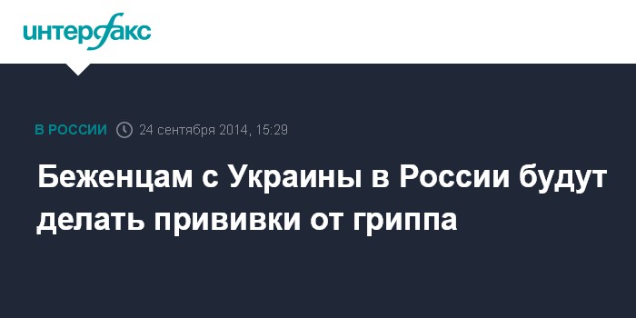 Москва. 24 сентября. INTERFAX.RU - Роспотребнадзор собирается прививать от гриппа всех беженцев с юго-востока Украины, сообщила в среду глава ведомства Анна Попова.