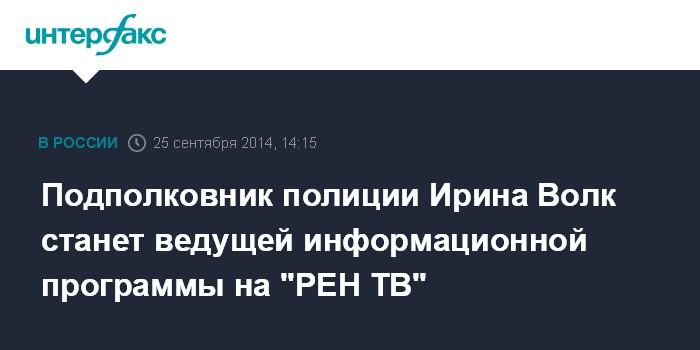 Москва. 25 сентября. INTERFAX.RU - Пресс-секретарь Управления экономической безопасности и противодействия коррупции московской полиции Ирина Волк будет вести новостную программу на телеканале РЕН ТВ, сообщил "Интерфаксу" источник, знакомый с деталями проекта.