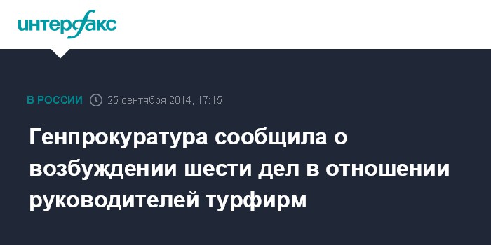 Москва. 25 сентября. INTERFAX.RU - В Генеральной прокуратуре заявляют, что по итогам проверок деятельности турфирм в Москве и Санкт-Петербурге возбуждено шесть уголовных дел в отношении руководителей компаний.