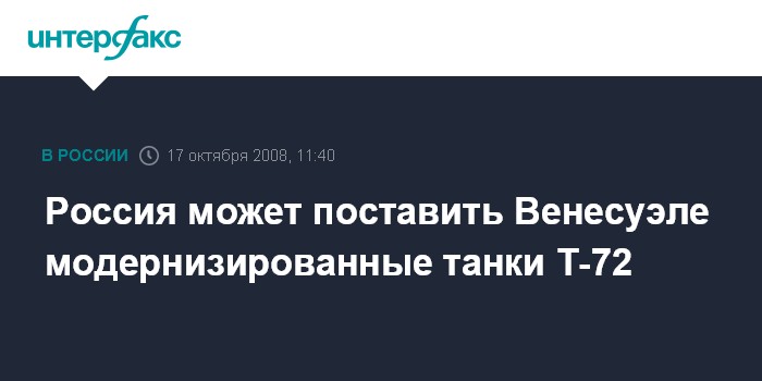 Москва. 17 октября. INTERFAX.RU - Москва и Каракас ведут переговоры о подписании очередного контракта на поставку Венесуэле танков Т-72М, сообщил "Интерфаксу-АВН" в пятницу высокопоставленный представитель российского оборонно-промышленного комплекса (ОПК).