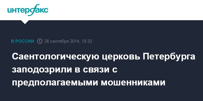 Москва. 26 сентября. INTERFAX.RU - Обыск, прошедший в Саентологической церкви Петербурга в четверг, проводился в рамках расследования уголовного дела о мошенничестве в особо крупном размере, возбужденном в отношении строительной компании и ее руководителя, сообщает в пятницу пресс-служба регионального главка МВД.