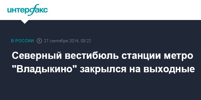 Москва. 27 сентября. INTERFAX.RU - Северный вестибюль станции метро "Владыкино" (выход на Сигнальный проезд) будет закрыт на два дня для замены системы электропитания эскалаторов. Об этом сообщает пресс-служба Московского метрополитена.