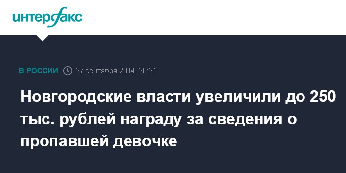 Москва. 27 сентября. INTERFAX.RU - Власти Новгородской области увеличили до 250 тыс. рублей вознаграждение за информацию, которая поможет установить местонахождение потерявшейся 10-летней девочки, сообщил "Интерфаксу" в субботу представитель областного управления СК РФ. Ранее за аналогичные сведения региональное УМВД обещало 50 тыс. рублей.
