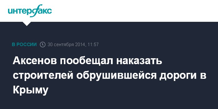 Москва. 30 сентября. INTERFAX.RU - Возможными причинами обрушения части объездной дороги вокруг Симферополя, которое стало причиной аварии, унесшей шесть жизней, являются халатность или должностные преступления при проектировании и строительстве дороги, версия теракта не рассматривается, сообщил и. о. главы Крыма Сергей Аксенов.