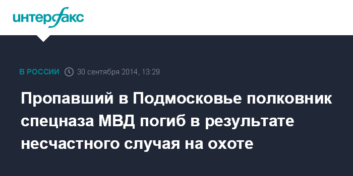Москва. 30 сентября. INTERFAX.RU - Полковник спецназа МВД, пропавший в Подмосковье во время охоты на минувшей неделе, найден погибшим, предварительно, в результате несчастного случая, сообщили "Интерфаксу" в пресс-центре МВД России.
