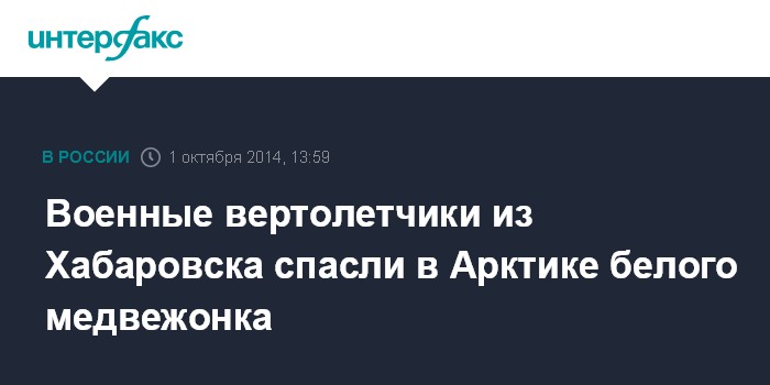 Москва. 1 октября. INTERFAX.RU - Экипаж вертолета Ми-26 из состава базы армейской авиации Восточного военного округа(ВВО) спас потерявшегося белого медвежонка.