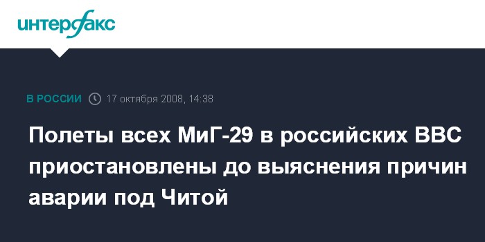 Москва/Чита.17 октября. INTERFAX.RU - Полеты всех истребителей МиГ-29 в российских Военно-воздушных силах временно приостановлены до выяснения причин аварии самолета в Читинской области, сообщил "Интерфаксу-АВН" представитель службы информации ВВС РФ Дмитрий Феофанов.