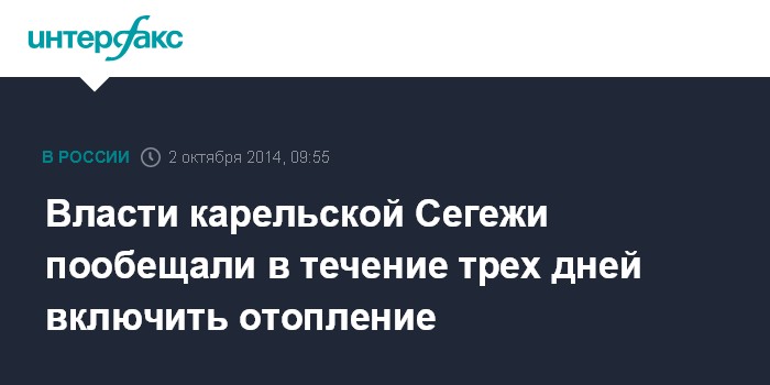 Москва. 2 октября. INTERFAX.RU - Власти карельской Сегежи пообещали в течение трех дней подключить город к отоплению, сообщили "Интерфаксу" в администрации Сегежского района.