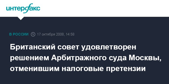 Москва. 17 октября. INTERFAX.RU - Британский совет выразил удовлетворение решением Арбитражного суда Москвы, который признал недействительной основную часть налоговых претензий к этой организации.