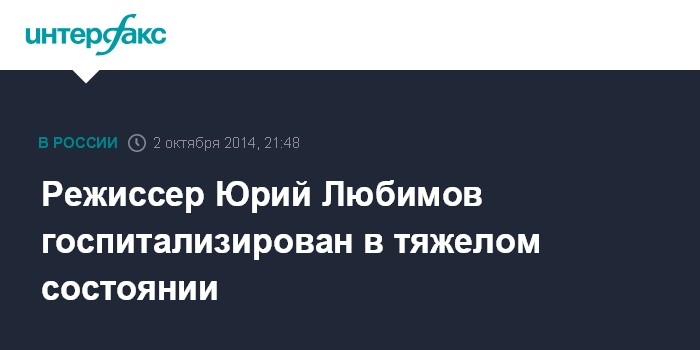 Москва. 2 октября. INTERFAX.RU - Основатель театра на Таганке 97-летний Юрий Любимов доставлен в больницу в тяжелом состоянии, сообщил "Интерфаксу" источник в медицинских кругах.