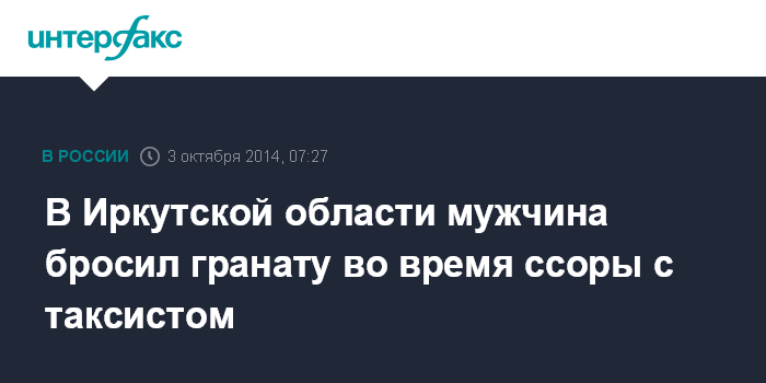 "Вечером в четверг мужчина, находящийся в сильном алкогольном опьянении, подошел к водителю такси в Ангарске и потребовал отвезти его в Иркутск. Тот отказался, возник конфликт, в ходе которого мужчина бросил на землю гранату", - сказал Струглин. По его словам, от взрыва пострадал сам мужчина и пассажир такси.
