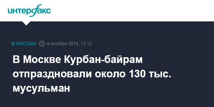 "В праздновании мусульманского праздника Курбан-байрам в столице всего приняло участие около 130 тыс. человек. В том числе порядка 50 тысяч верующих собрались возле Московской соборной мечети, столько же - у Мемориальной мечети на Поклонной горе",- заявил сотрудник пресс-службы.