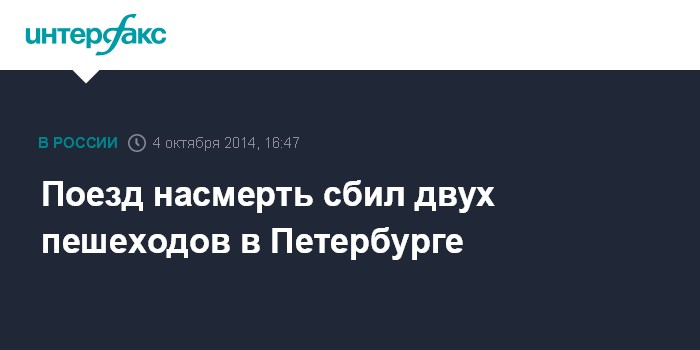 Москва. 4 октября. INTERFAX.RU - Пассажирский поезд в Санкт-Петербурге насмерть сбил двух пешеходов, сообщили "Интерфаксу" в пресс-службе Октябрьской железной дороги (филиал ОАО "РЖД").