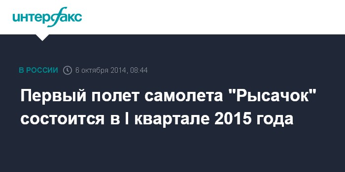 Москва. 6 октября. INTERFAX.RU - Первый полет 16-местного легкого многоцелевого самолета "Рысачок" запланирован на I квартал 2015 года, сообщил "Интерфаксу" источник в оборонно-промышленном комплексе.