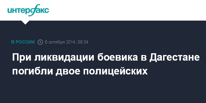 Москва. 6 октября. INTERFAX.RU - По предварительным данным, двое сотрудников правоохранительных органов погибли в боестолкновении в селении Кироваул Кизилюртовского района Дагестана, убит один боевик.