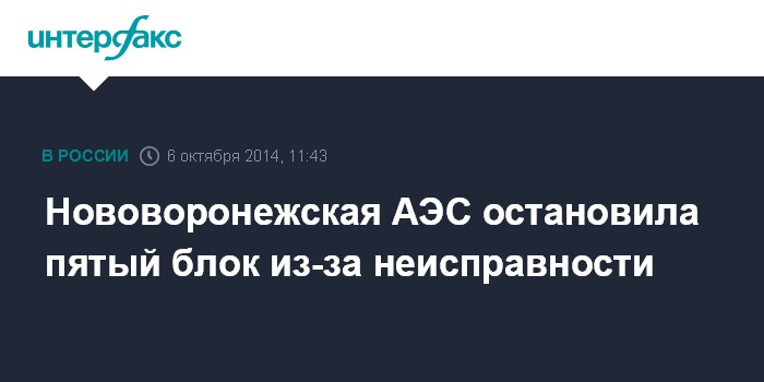 Москва. 6 октября. INTERFAX.RU - Нововоронежская АЭС остановила пятый энергоблок для устранения неисправности, говорится в сообщении станции.