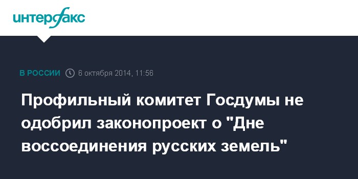 Москва. 6 октября. INTERFAX.RU - Профильный комитет Госдумы решил вернуть авторам законодательной инициативы проект закона, в соответствии с которым предлагается установить в России 18 марта новую памятную дату - "День воссоединения русских земель".