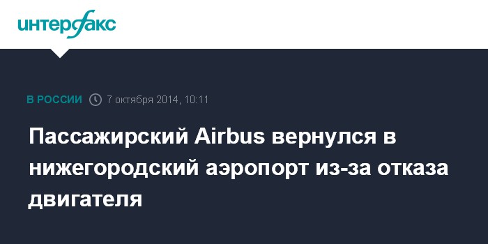 Москва. 7 октября. INTERFAX.RU - Пассажирский Airbus, направлявшийся из Нижнего Новгорода в Москву, вернулся в аэропорт вылета из-за отказа одного из двигателей, сообщил "Интерфаксу" источник в экстренных службах аэропорта "Стригино" (Нижний Новгород).