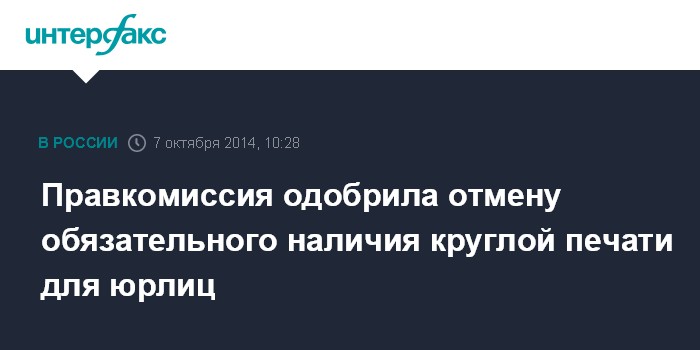 Москва. 7 октября. INTERFAX.RU - Комиссия правительства РФ по законопроектной деятельности одобрила внесенный Минэкономразвития законопроект об отмене обязательного наличия у хозяйственных обществ круглой печати, сообщается на сайте правительства.
