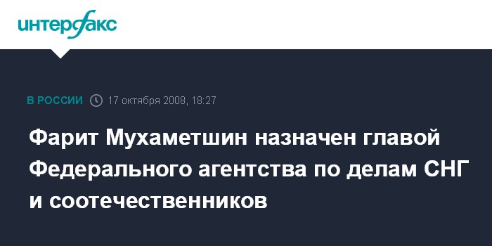 Москва. 17 октября. INTERFAX.RU - Президент РФ Дмитрий Медведев подписал указ о назначении Фарита Мухаметшина руководителем Федерального агентства по делам СНГ, соотечественников, проживающих за рубежом и по международному гуманитарному сотрудничеству, сообщили в пресс-службе президента РФ в пятницу.