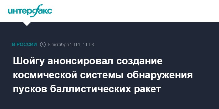 Москва. 9 октября. INTERFAX.RU - Россия создает единую космическую систему для обнаружения пусков баллистических ракет, которая станет одним из ключевых направлений развития сил и средств ядерного сдерживания, заявил в четверг министр обороны генерал армии Сергей Шойгу.