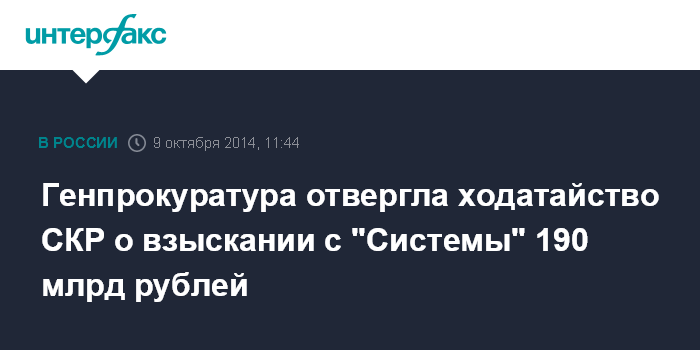 Генпрокуратура отвергла ходатайство СКР о взыскании с "Системы" 190 млрд рублей