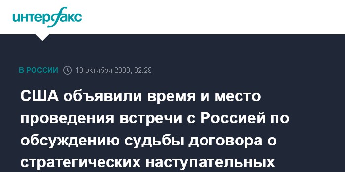 Вашингтон. 18 октября. ИНТЕРФАКС - Россия и США проведут встречу в Женеве в середине ноября для обсуждения судьбы договора о стратегических наступательных вооружениях. Об этом сообщила в пятницу вечером в столице США пресс-служба Госдепартамента.