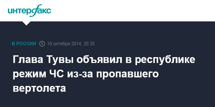 Москва. 10 октября. INTERFAX.RU - В Республике Тува объявлен режим чрезвычайной ситуации из-за исчезновения вертолета Ми-8, сообщается на официальном портале республики.