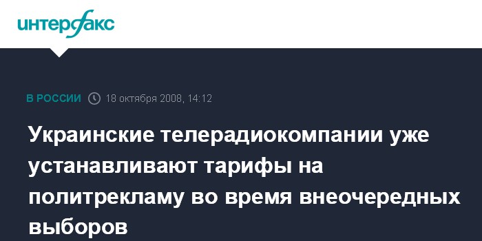 Москва. 18 октября. INTERFAX.RU - Ряд украинских телерадиокомпаний обнародовали свои расценки на эфирное время для проведения предвыборной агитации во время внеочередных выборов в Верховную Раду.