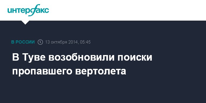 Москва. 13 октября. INTERFAX.RU - Поиски пропавшего вертолета Ми-8 возобновлены с утра понедельника в Туве, сообщает пресс-служба Сибирского регионального центра МЧС.
