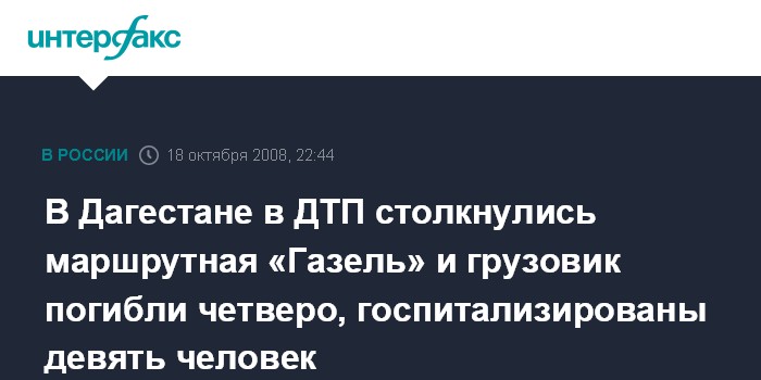 "ДТП произошло в 20:45 мск в субботу на территории Левашинского района Дагестана. Маршрутная "Газель", в которой находились 15 человек, столкнулась с грузовиков. В результате четверо погибли и девять человек травмированы".