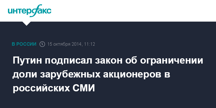 Москва. 15 октября. INTERFAX.RU - Законопроект, ограничивающий долю иностранного капитала в российских средствах массовой информации 20 процентами, подписан президентом РФ Владимиром Путиным, сообщает официальный интернет-портал правовой информации.