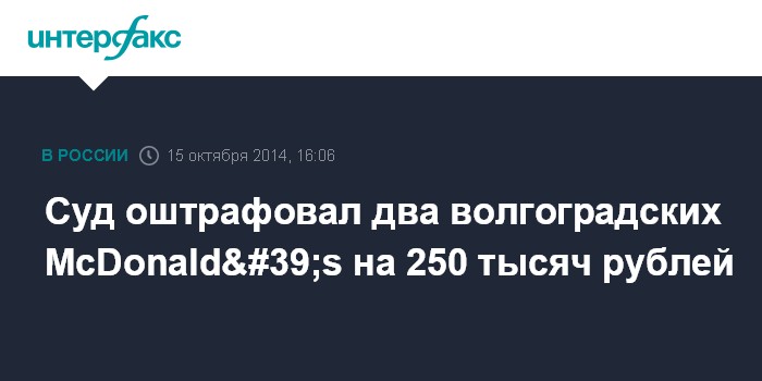 Москва. 15 октября. INTERFAX.RU - Арбитражный суд Волгоградской области назначил административный штраф в отношении двух ресторанов "Макдоналдс" в Волгограде, сообщили агентству "Интерфакс" в пресс-службе суда.