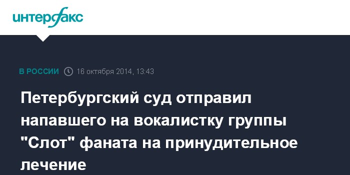 Москва. 16 октября. INTERFAX.RU - Куйбышевский районный суд признал невменяемым фаната группы "Слот", напавшего с ножом на вокалистку коллектива в Петербурге, и отправил его на принудительное лечение, сообщил "Интерфаксу" адвокат Игорь Карпов после заседания в четверг.