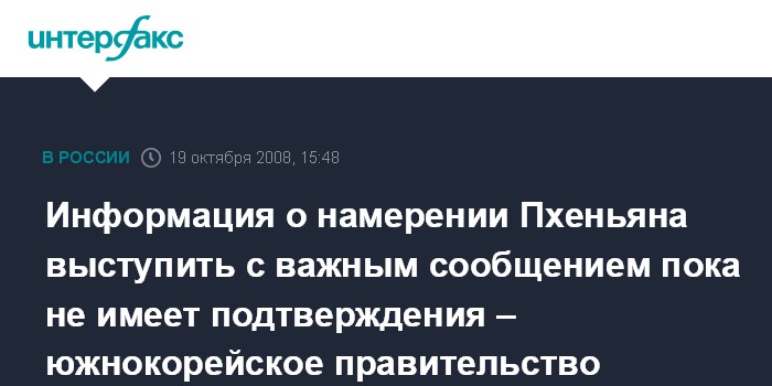 Сеул. 19 октября. INTERFAX.RU - Правительство Южной Кореи не располагает подтвержденной информацией о том, что руководство КНДР в ближайшие дни может выступить с важным заявлением, сообщили в воскресенье ведущие СМИ Республики Корея со ссылкой на южнокорейское министерство по делам объединения.