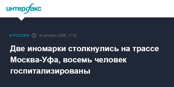 Казань. 19 октября.INTERFAX.RU - В результате столкновения двух автомобилей в воскресенье на 1003-м км автодороги Москва-Уфа в Елабужском районе Татарстана серьезно пострадали восемь человек.