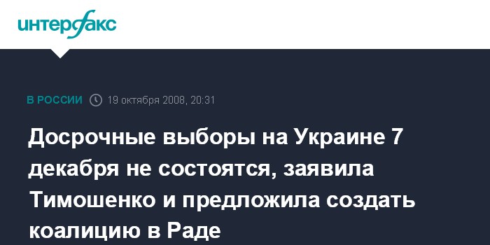 "Я обращаюсь к президенту Украины, ко всем политическим силам страны, к лидерам фракций ... с четкими и понятными предложениями. Нам необходимо срочно возобновить работу для срочного принятия необходимых законов, в том числе и бюджета. Завтра в 12:00 необходимо собраться всем фракциям Верховной Рады Украины и создать коалицию защиты от всемирного финансового кризиса", - заявила Ю.Тимошенко в ходе своего телеобращения к гражданам Украины в воскресение.