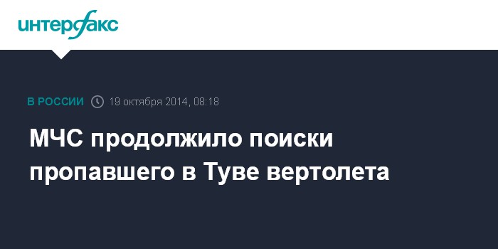 Москва. 19 октября. INTERFAX.RU - В Туве продолжаются поиски экипажа и пассажиров пропавшего 7 октября вертолета Ми-8, сообщает в воскресенье ГУ МЧС РФ по региону.