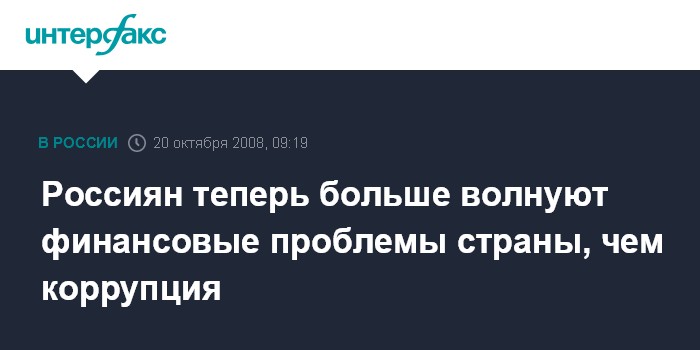 Москва. 20 октября. INTERFAX.RU - Представления россиян о приоритетах деятельности правительства претерпели некоторые изменения - на первое место вышла задача решения финансовых проблем, поддержки банков, тогда как год назад граждане считали важнейшей борьбу с коррупцией, свидетельствуют социологи.