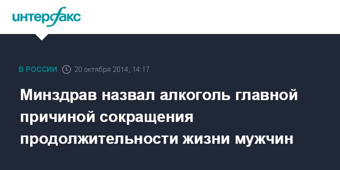 Москва. 20 октября. INTERFAX.RU - Употребление алкоголя и сопряженные с этим несчастные случаи являются одними из основных факторов, влияющих на продолжительность жизни мужчин в России. Об этом заявила глава Минздрава Вероника Скворцова на встрече с президентом РФ Владимиром Путиным.