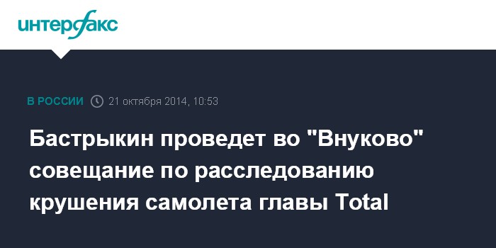 Москва. 21 октября. INTERFAX.RU - Председатель Следственного комитета Александр Бастрыкин проведет в аэропорту "Внуково", где в авиакатастрофе погиб глава французской нефтяной компании Total, совещание со следственно-оперативной группой и службами терминала, сообщил официальный представитель ведомства Владимир Маркин.