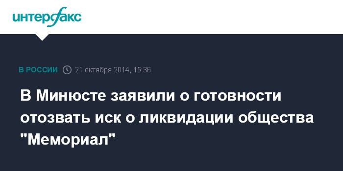 Москва. 21 октября. INTERFAX.RU - Минюст России может отозвать свой иск из Верховного суда с ходатайством о ликвидации правозащитного общества "Мемориал", сообщили в пресс-службе министерства.